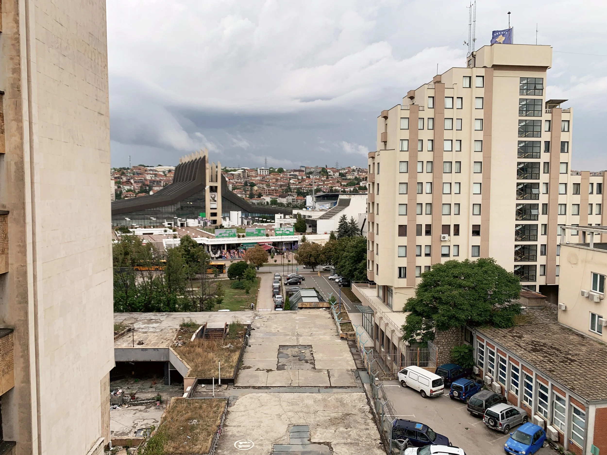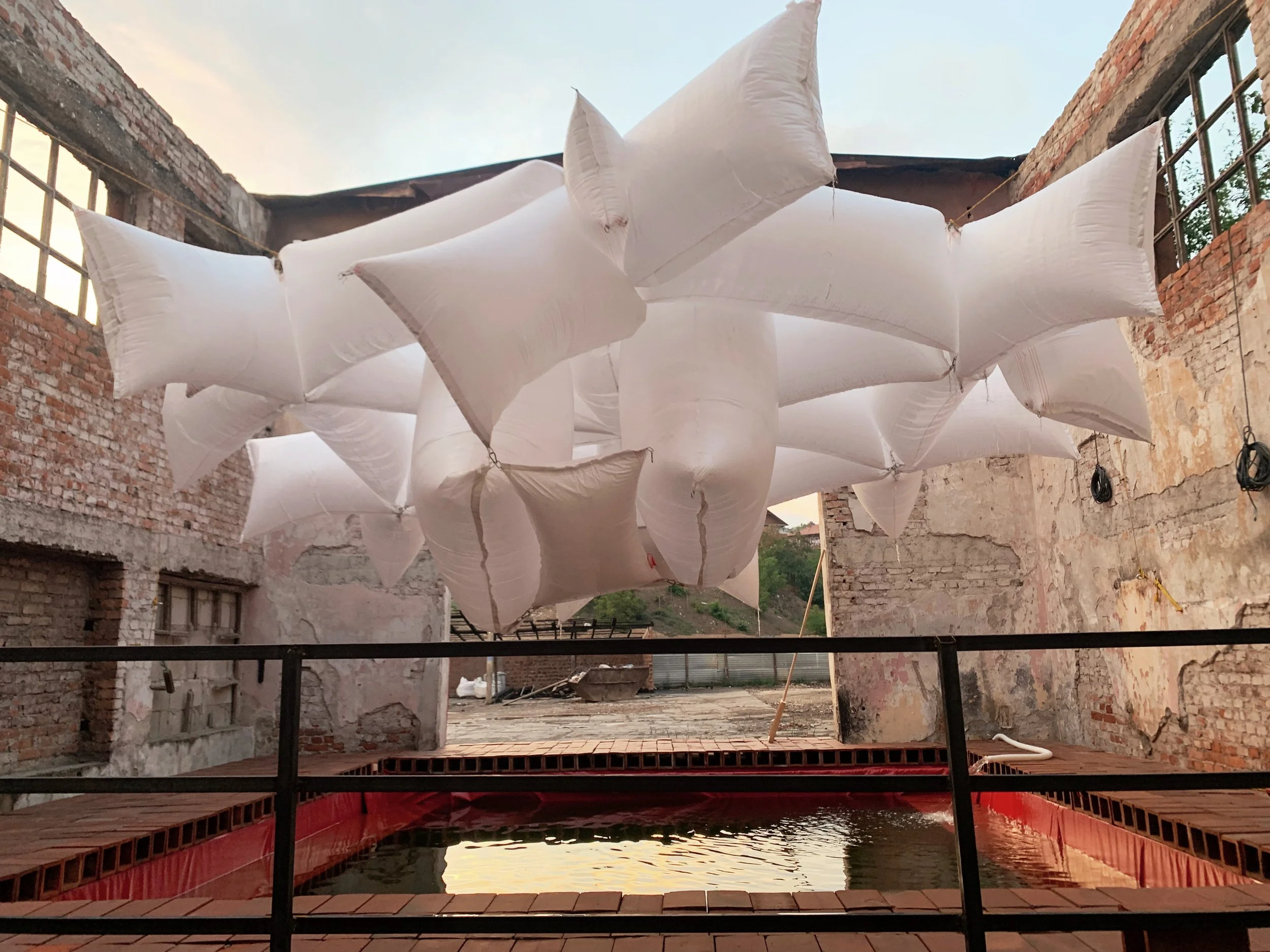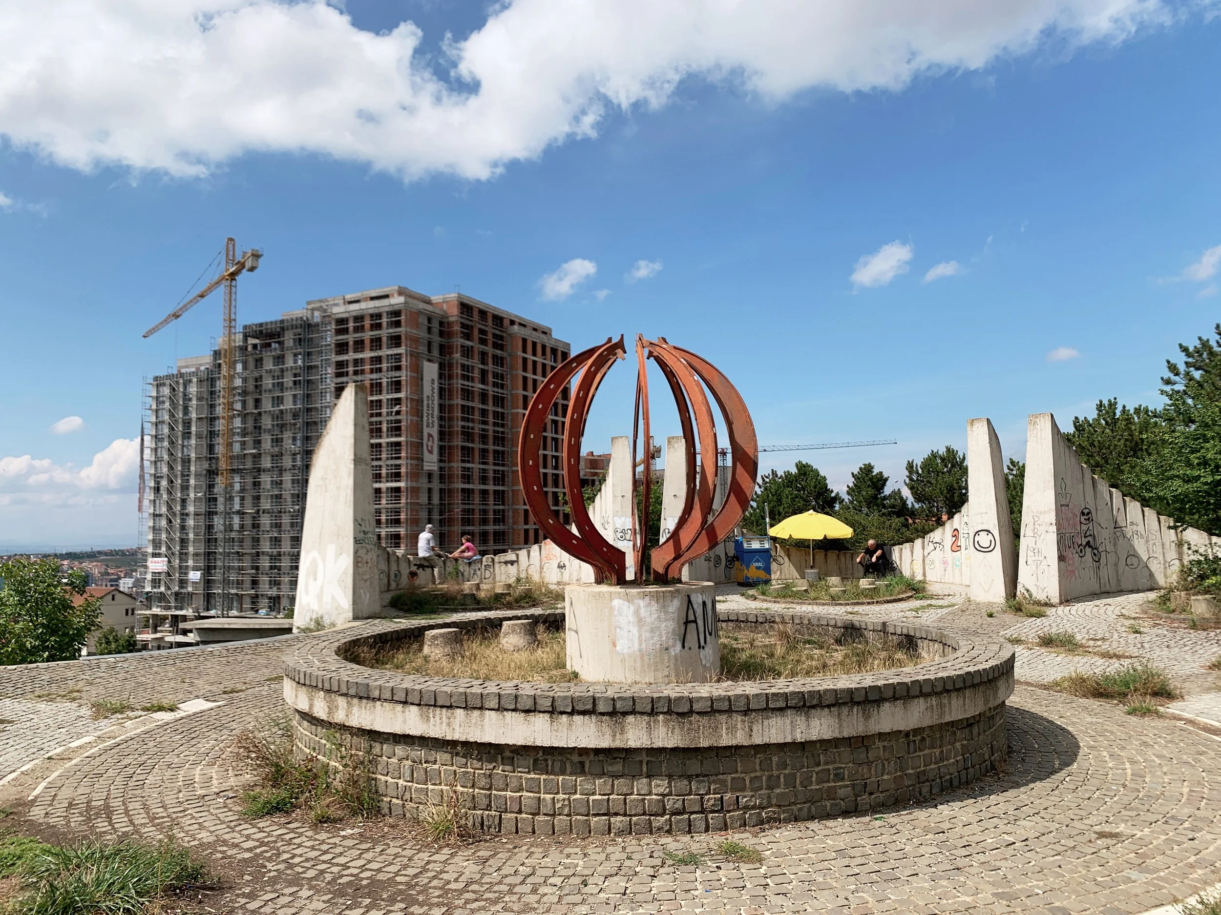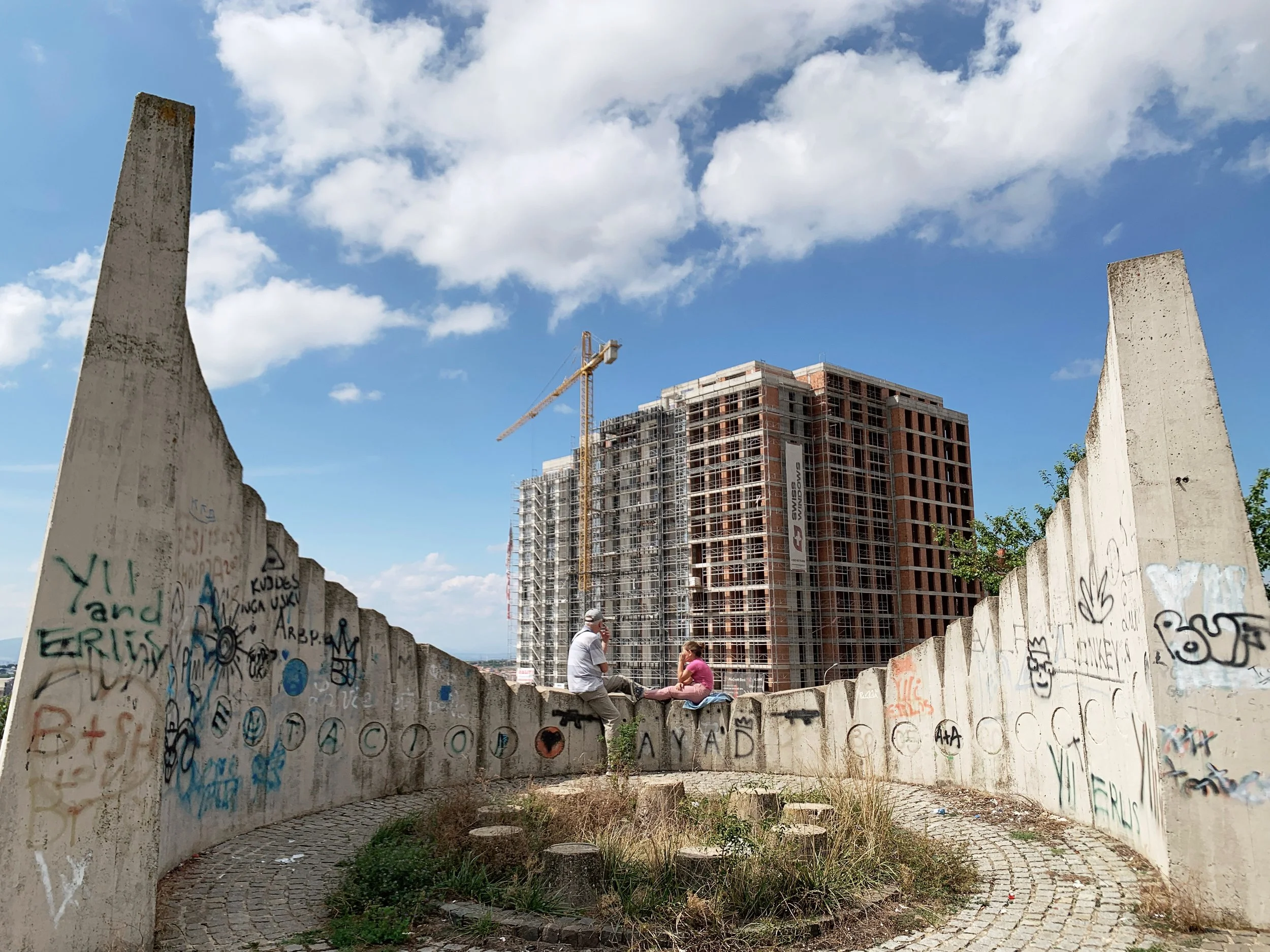 I joined a tour of some of the Manifesta sites that included the Palace of Youth and Sports—a deteriorating entertainment complex build in the mid-seventies, currently partially-privatized and utilizing—much to the dismay of our tour guide—a former playing field as an indoor parking garage, as well as a former brick factory converted into a provisional school and recreation center, a former printing house being used to exhibit an art installation, and an architectural intervention by the Italian architect Carlo Ratti that converted a decommissioned rail line into a bright yellow walking path with some ornamental landscaping. These initiatives elicited a range of responses from our group that included local West Balkan youth, two cultural programmers with the Flemish government, a graphic designer from Leipzieg interested in city-wide temporary design languages, a postgraduate working on issues of colonial extractivism in relation to performance studies, a psychotherapist and filmmaker working with diasporic Albanians and several others I didn’t get the chance to engage with. The tour was given by a local artist who reiterated her desire—and inability—to travel, while also expressing her appreciation for this cultural exchange.