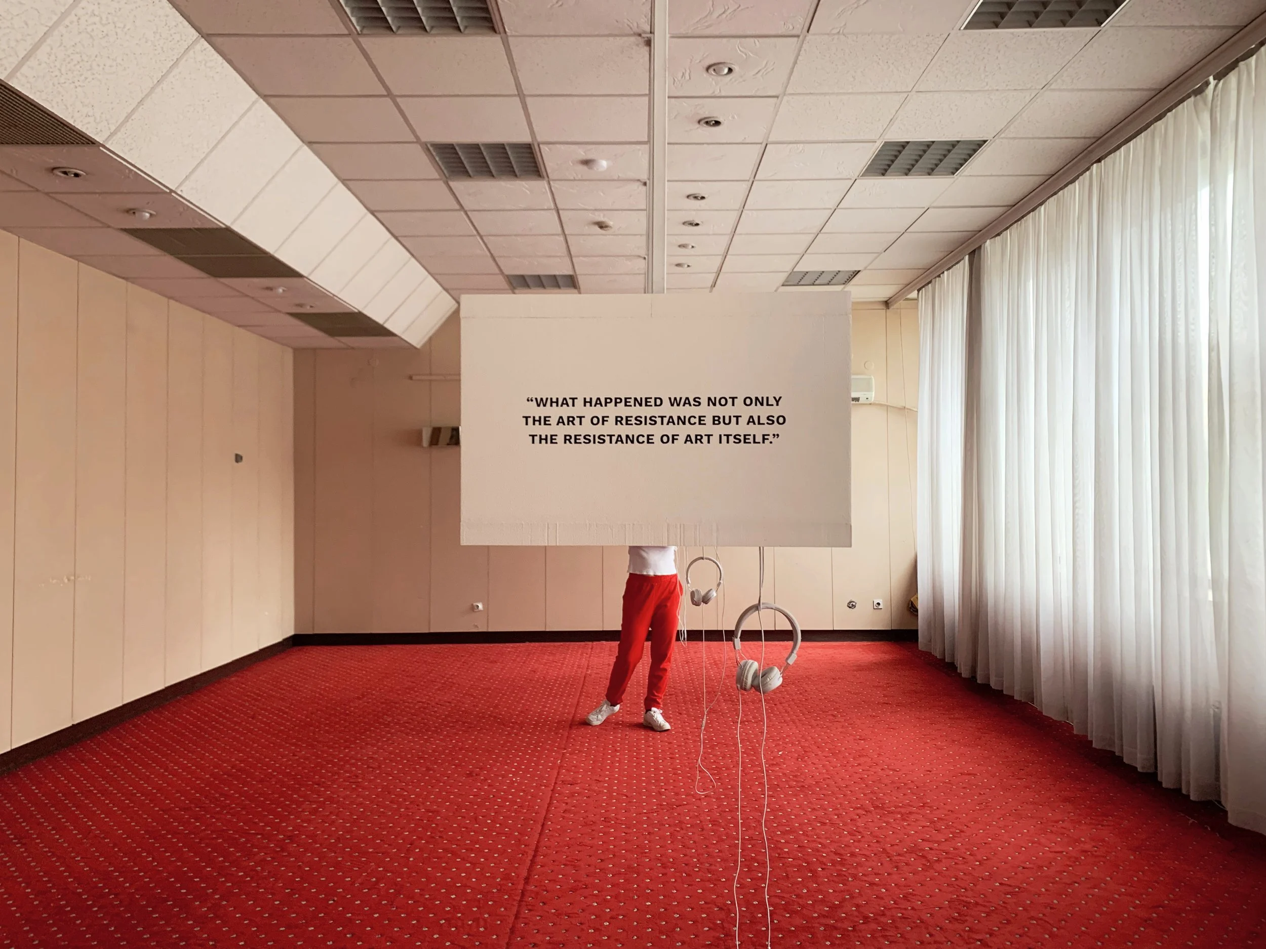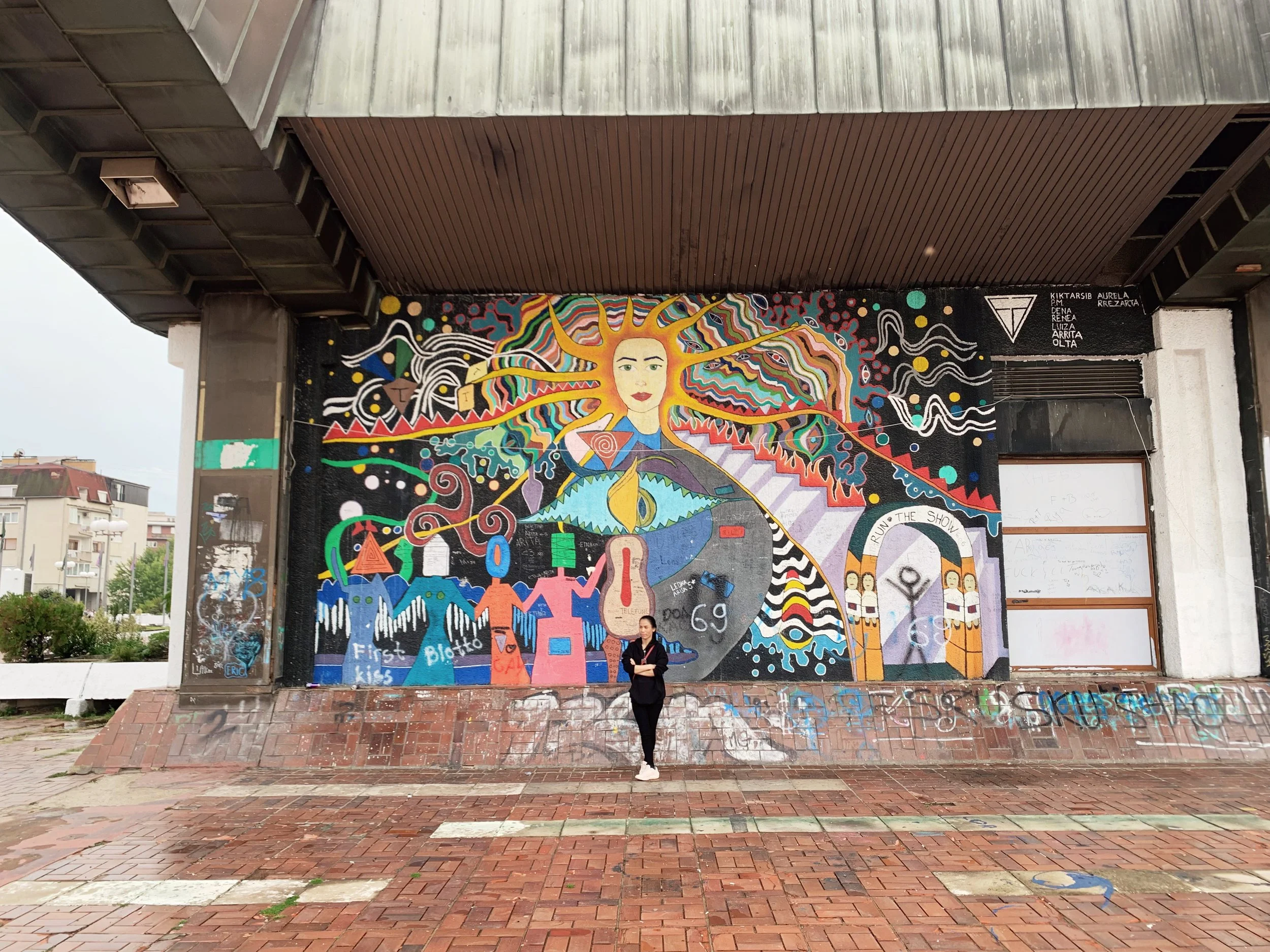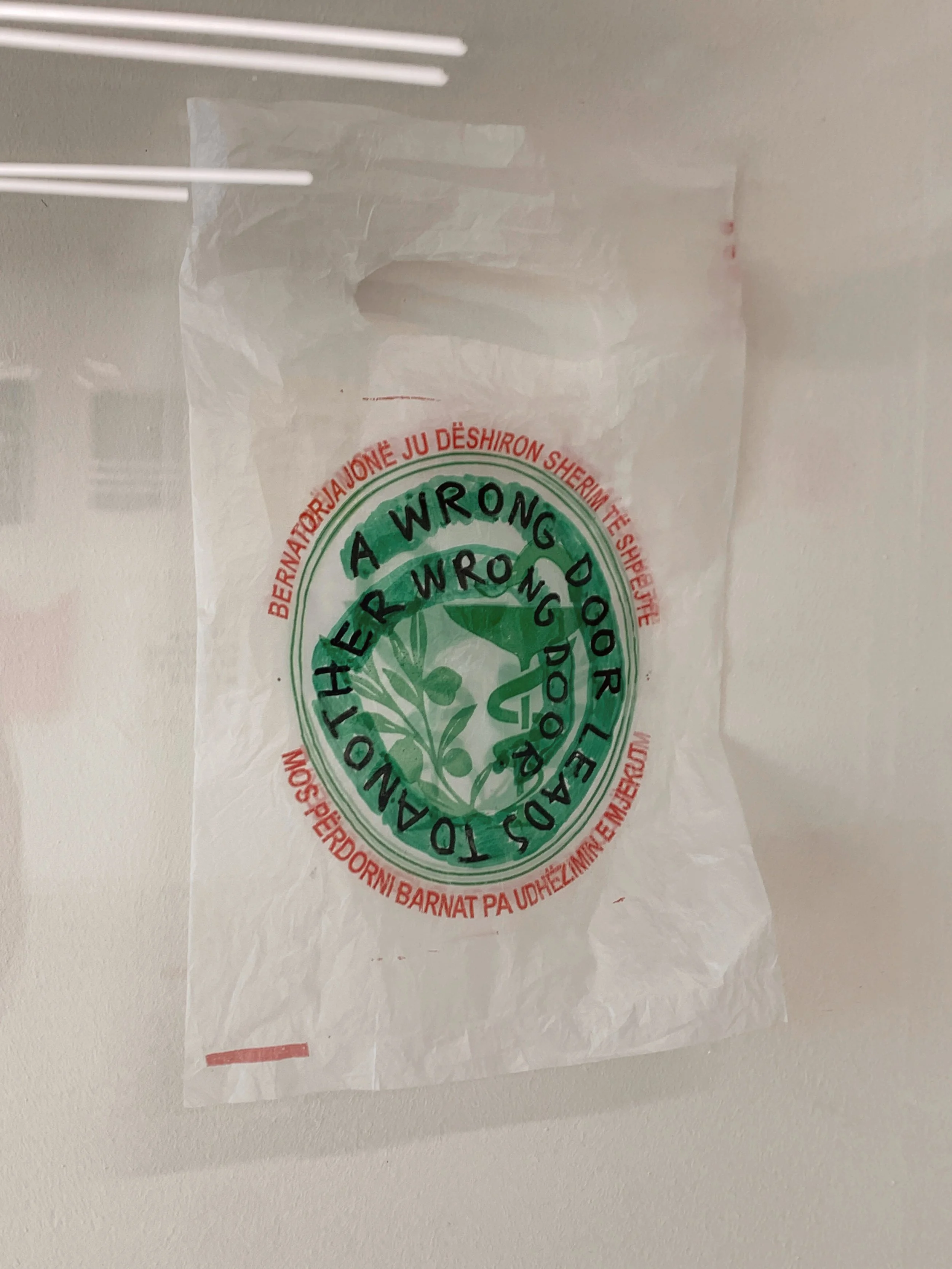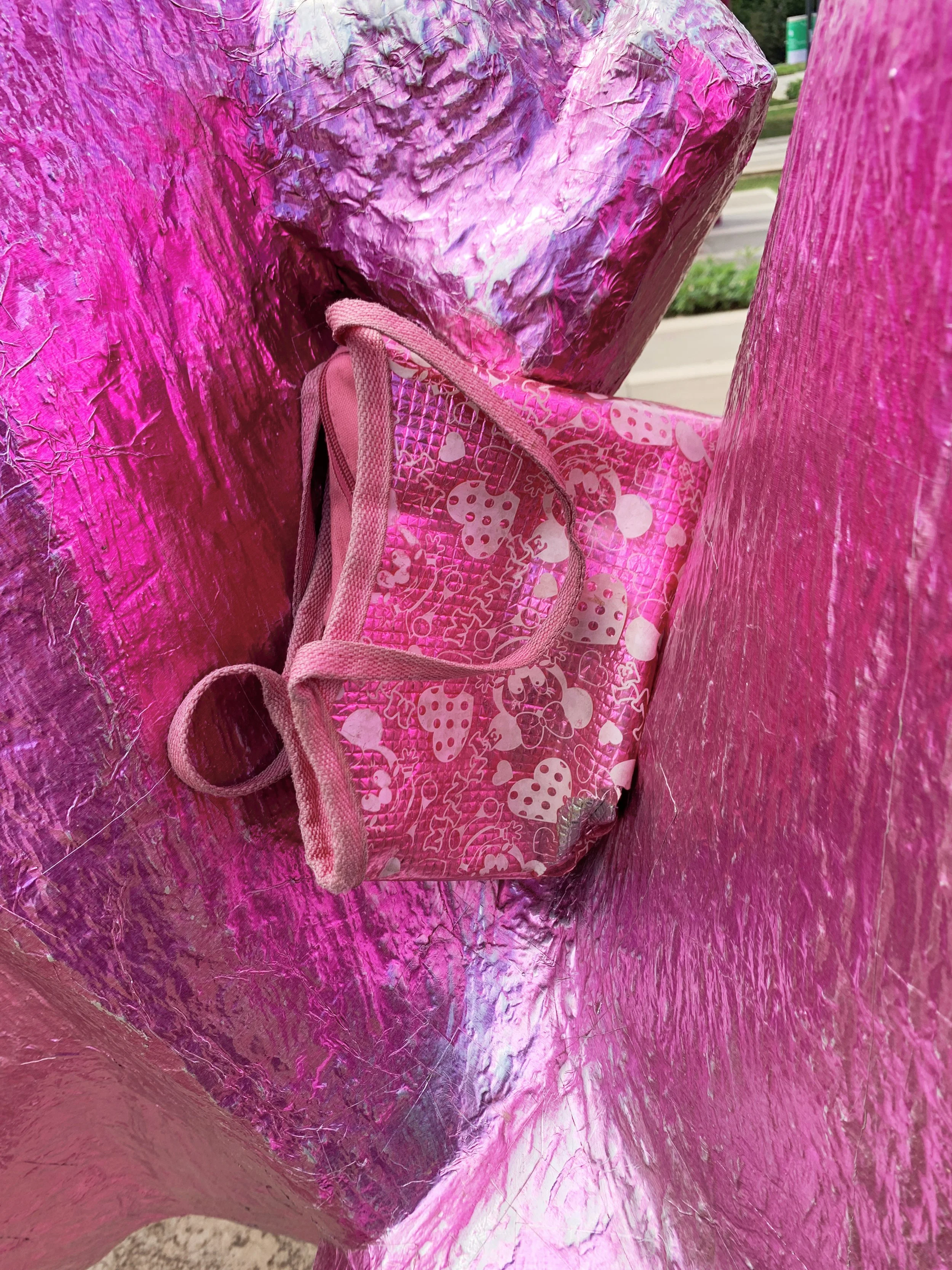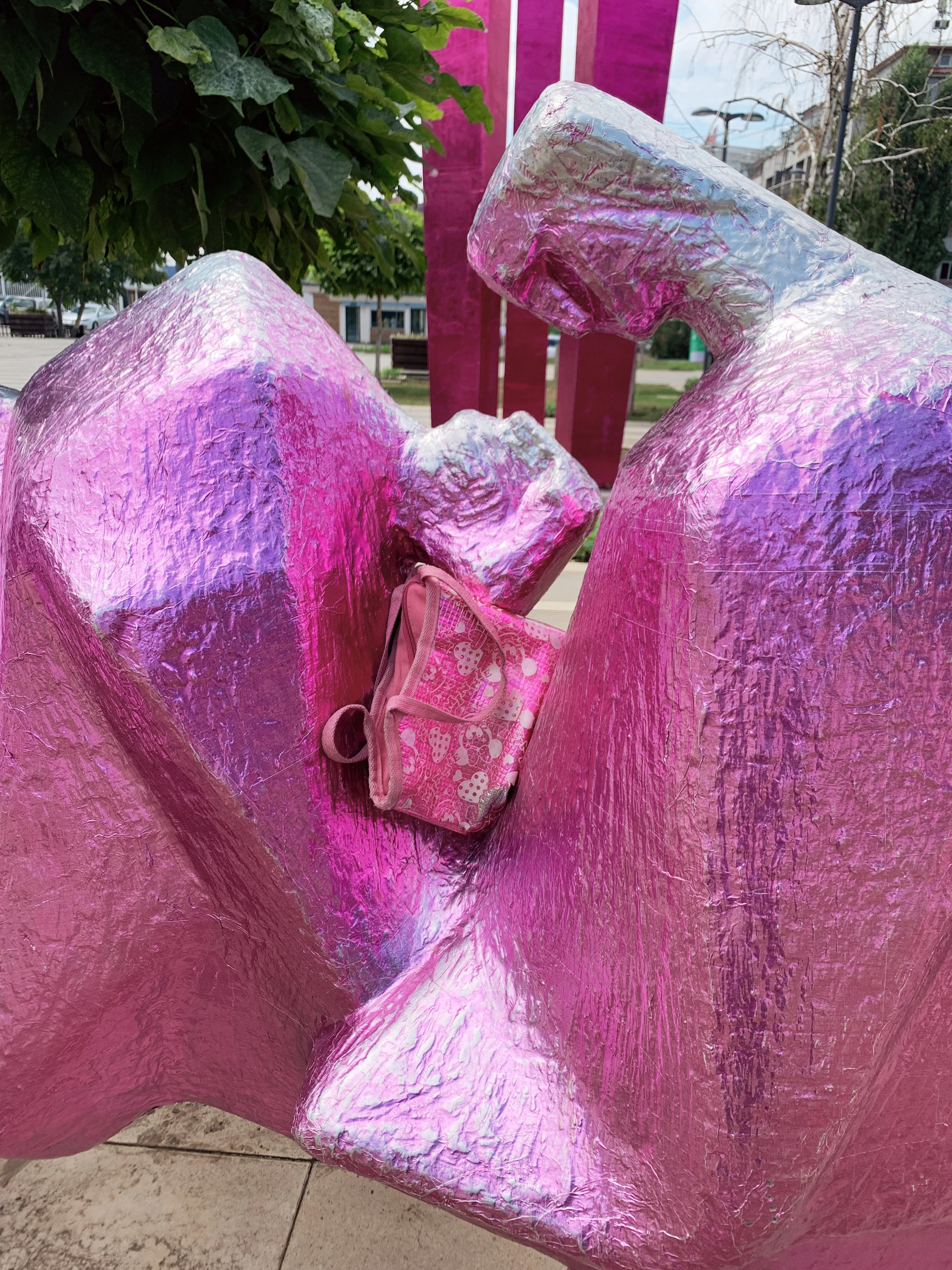 Swiss artist Ugo Rodinone’s contribution not a word not a thought not a need not a grief not a joy not a girl not a boy not a doubt not a trust not a lust not a hope not a fear not a smile not a tear not a name not a face not a time not a place not a thing wrapped the contested Tito-era socialist modernist Brotherhood monument to fallen partisan soldiers in Adem Jashari square in a shiny purple foil, and set off alarms for me (as a self-appointed and perhaps irredeemably naive arbiter of ethical internationalist exhibition-making). Its candy-bar like social media-readiness, glib call to ‘revel in the pure sensory experience of color, form and mass,’ and further confusing evocation of Beckett’s Watts, felt like a cheap intervention that offers more to the artist than any kind of meaningful engagement with the community and its complex history. In a counter-intervention, from a presumably local and anonymous artist, a small pink plastic backpack with minnie mouse prints on it was placed inside the foiled monument.