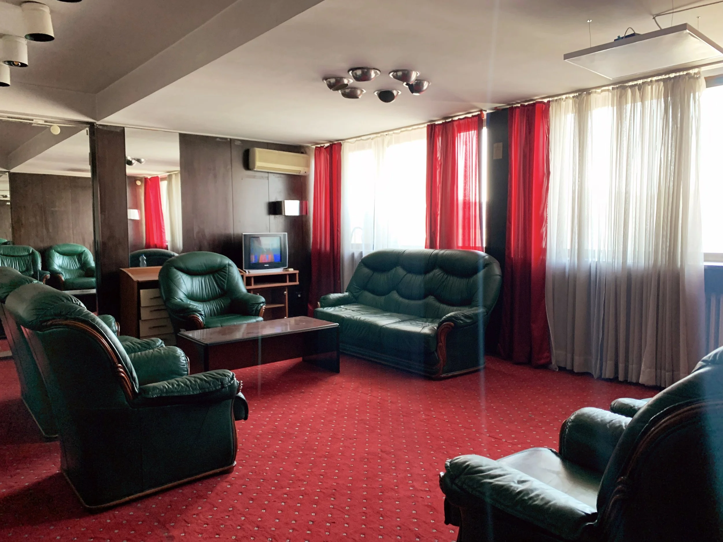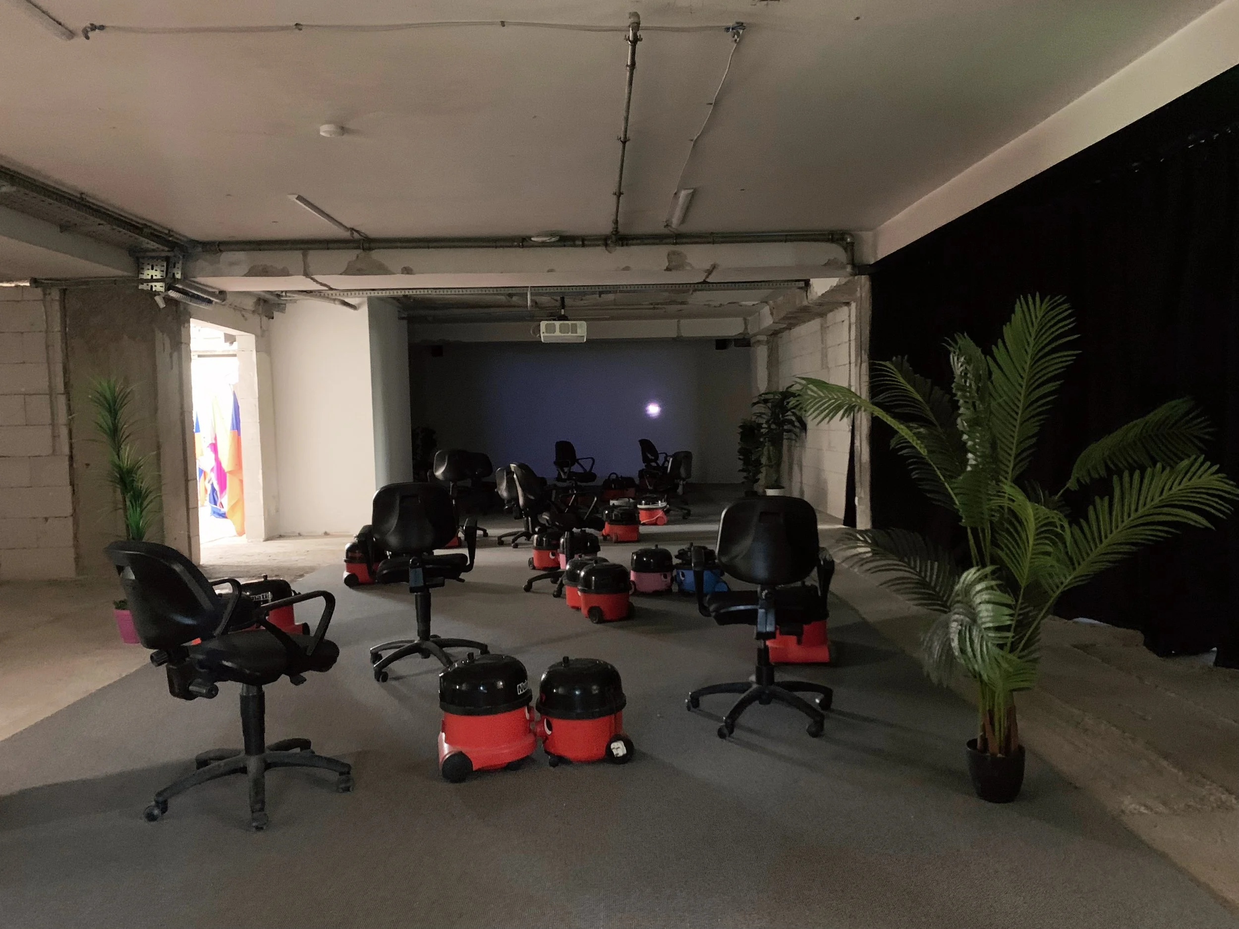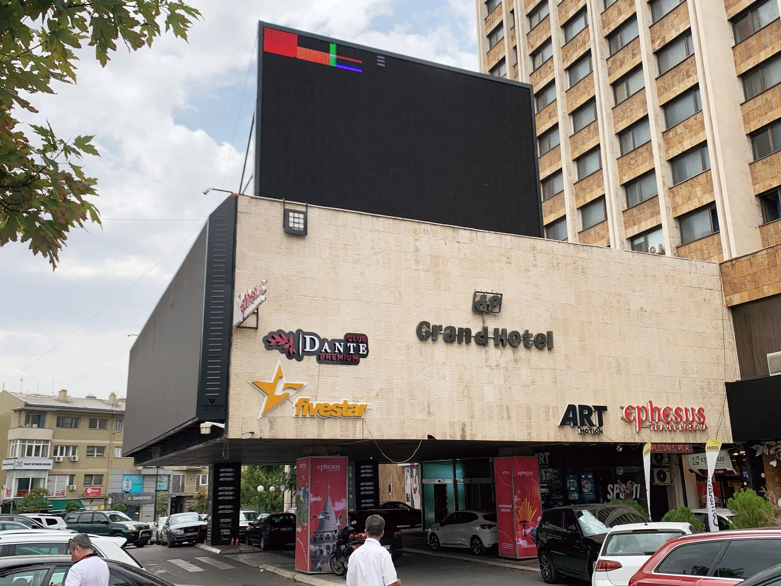 I generally observed a light irreverence towards the Manifesta proceedings from the Pristina locals, which actually felt quite refreshing. In one single-channel installation at the Grand Hotel by Larry Achiampong, concerned with the lives of migrant workers, a series of anthropomorphized vacuum cleaners were arranged around the room—in what I took as a choreography of alienation, and to which some youthful and bored invigilators rearranged into pairs that appeared to be kissing. A Kosovar curator and artist named Ardian Ajdini intervened in the Grand Hotel portion of the exhibition, collecting invigilators while performing hilarious and historically-grounded tours. Actually, many of my attempts to go look at art were derailed by Ardian and other new friends who would steer me towards local eateries like Baba Ghanoush and Tiffany’s where we would settle into long and art-ful conversations over delicious food.