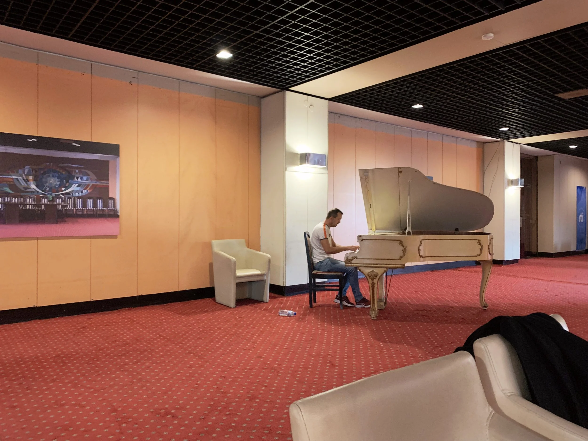 The haunting of the photos of the hotel’s former grandeur. The piano music and the docents singing together with the hotel staff. The way the invigilators get bored and rearrange the art.